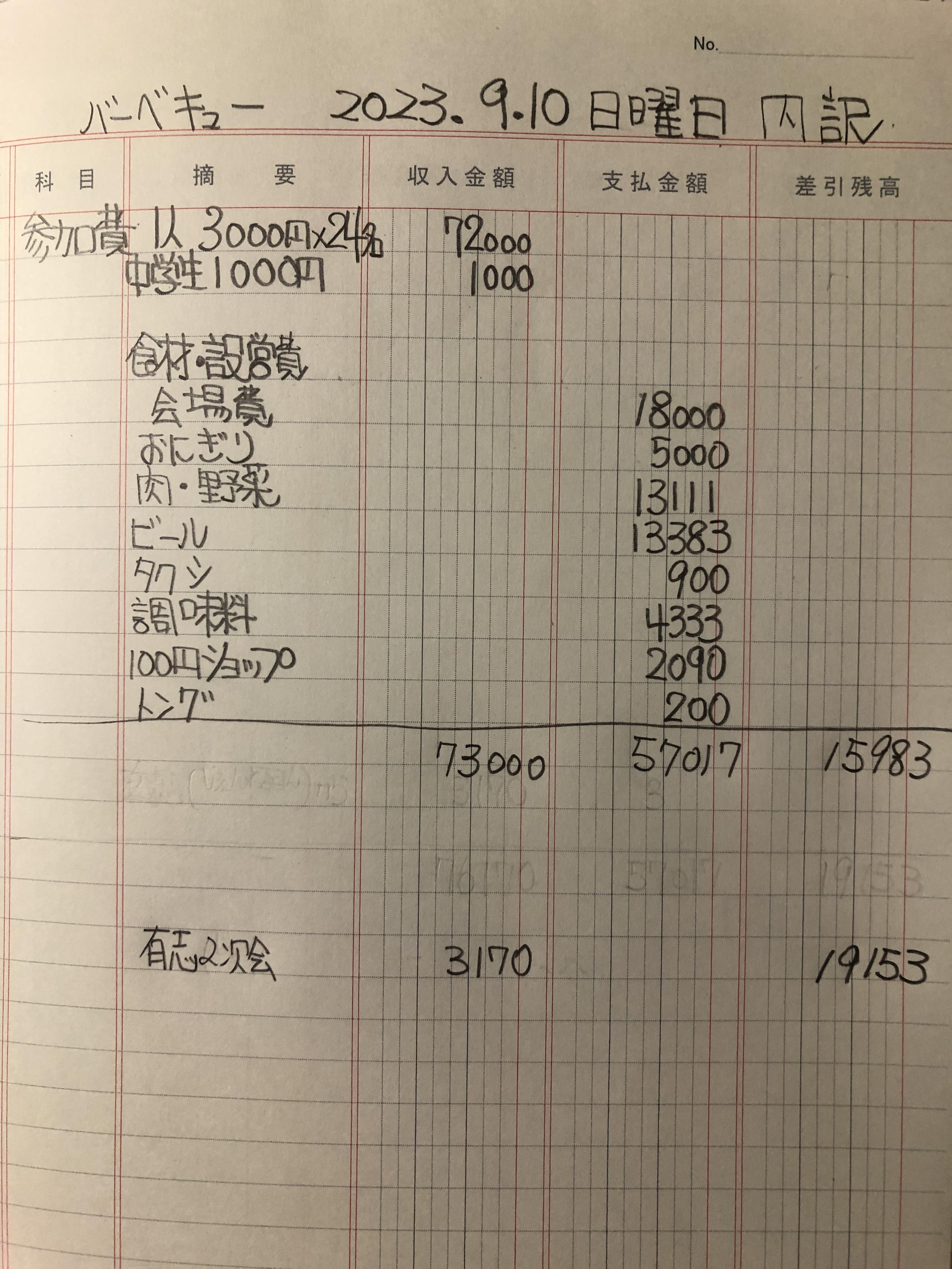 2023年9月10日BBQ 会計を報告致します。